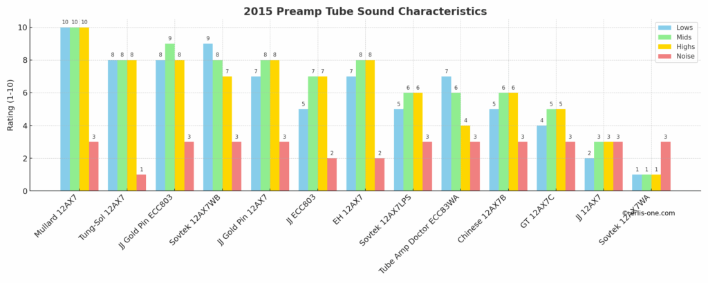 対して JJ 12AX7 や Sovtek 12AX7WA は全体的に平均点で、耐久性やコスト面を重視する人向けといえるでしょう。2015年当時と比べると、全体的に「低ノイズ・扱いやすさ」を重視する傾向がより強まっているのが特徴です。