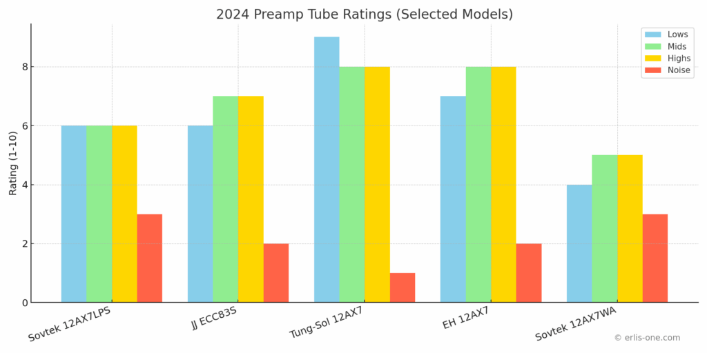 今回の2024/2025年版の評価では、Mullard 12AX7 が依然として中域の厚みと滑らかさで高評価を得ています。