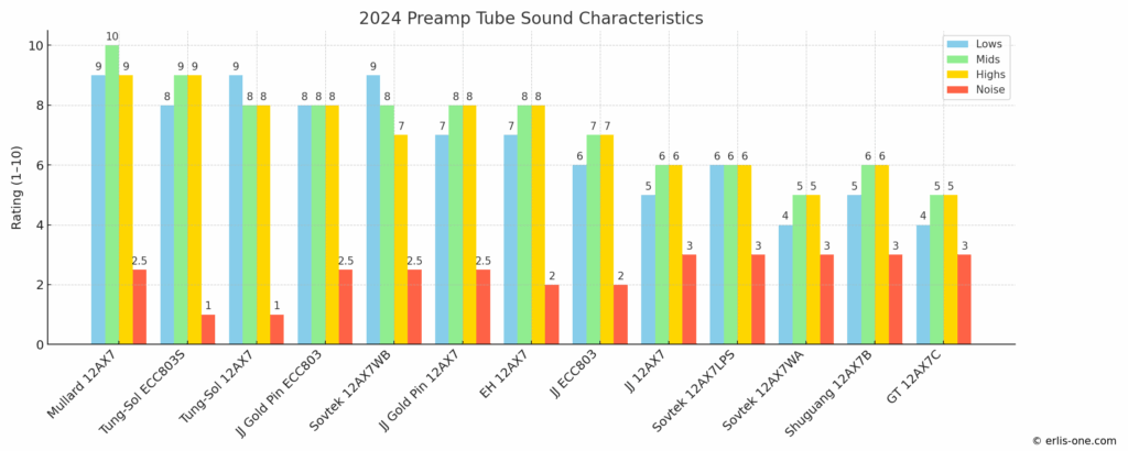 一方で Tung-Sol ECC803S や Tung-Sol 12AX7 はノイズが非常に少なく、現代の録音環境やハイゲイン用途での信頼度が増しています。