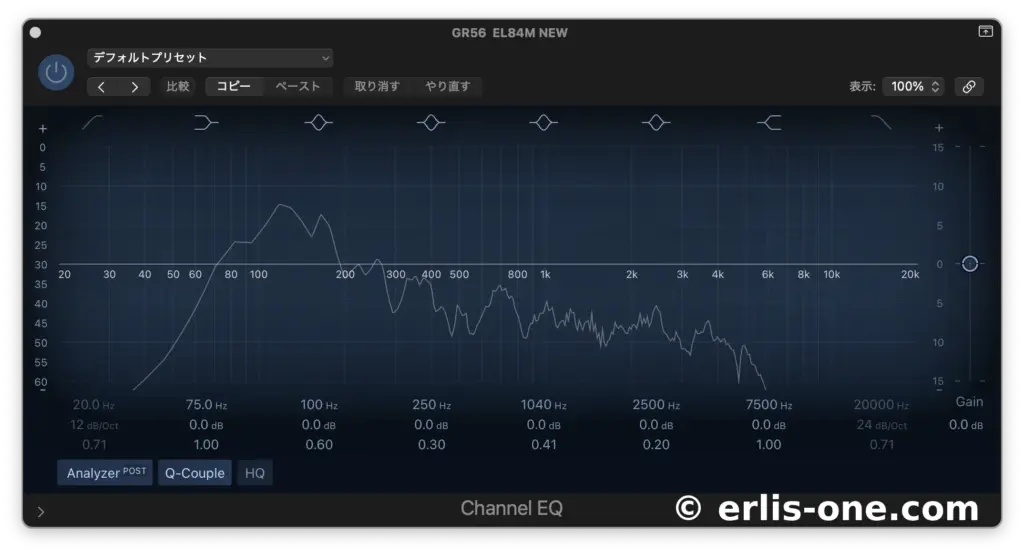 DAW上のChannel EQで視覚化したスペクトラムがこちら。実際のミックス作業や音作りにおいては、このようなリアルタイムの視覚フィードバックが非常に重要になる。